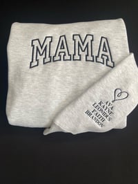 If you would like this hoodie designed custom with your babies/kiddos names or their initials, or birth dates-- don't hesitate to ask through the notes or contact section of the site. An added cost of $30-$40 will be invoiced separately. Depending on how much is added/designed & embroidered. Customized names can either be added underneath the MAMA on the center of the chest or on the wrist of the hoodie if you prefer. It just means communicating to Davina what you would like created for your customized piece.