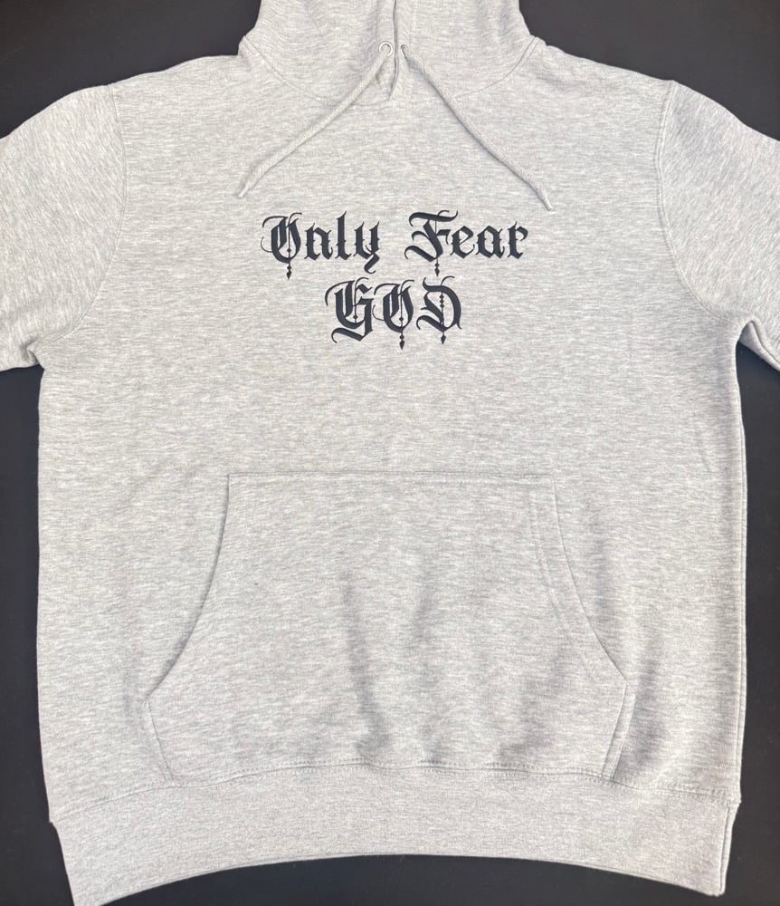 "Only Fear GOD" Hoodies now available after Davina made this design in a fancy Old English style font after getting it tattooed on her wrist. It's a statement to anyone who may be needing a reminder to fear nothing and no one BUT God in this lifetime. Being God fearing doesn't mean to be afraid of God at all, but to TRUST in Him to handle all your worries or problems.